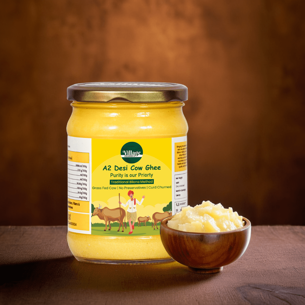 Bringing the essence of our village to your table, our pure desi cow ghee is crafted with care using the traditional Bilona method, churning goodness and purity into every drop.